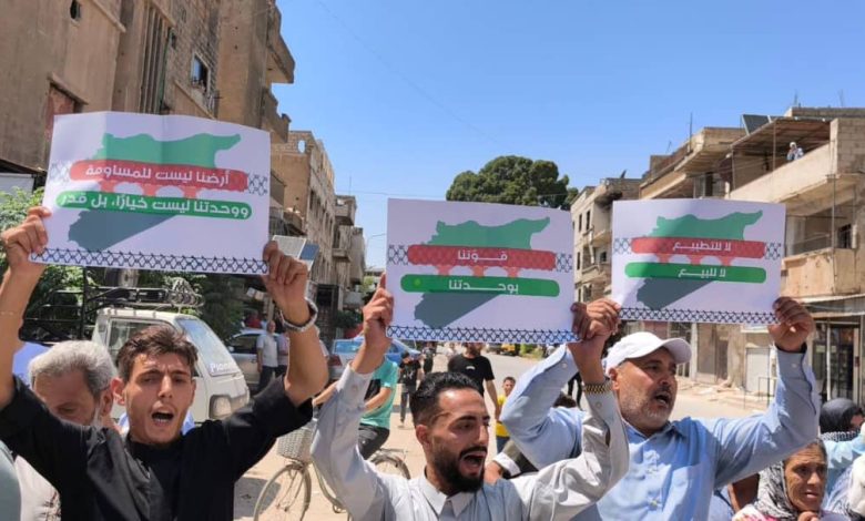 وشهدت الوقفة مشاركة واسعة من المواطنين الذين عبّروا عن تمسكهم بوحدة التراب السوري، ورفضهم للمساومة مع الاحتلال الصهيوني بشان الاراضي السورية لاسيما الجولان المحتل.