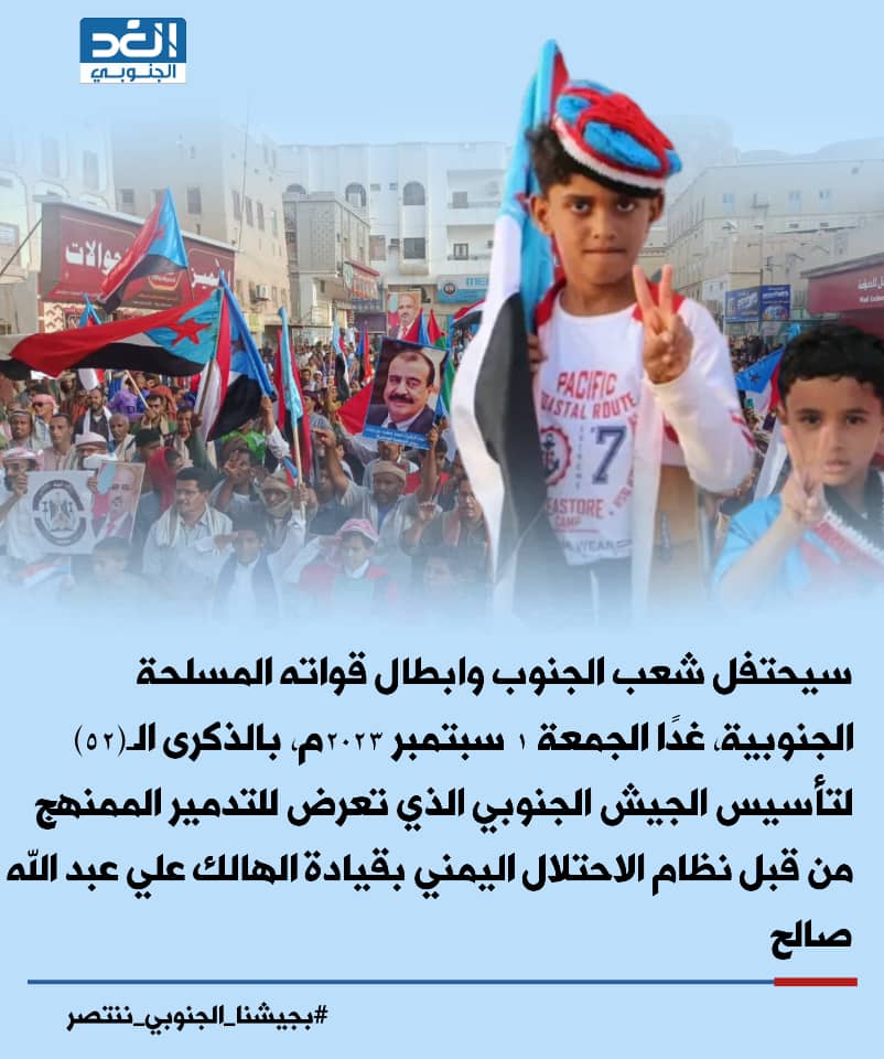 وأشاروا إلى أن: “الذكرى الثانية والخمسون لتأسيس الجيش الجنوبي، والتي تصادف الأول من سبتمبر من كل عام، تأتي في ظل انتصارات صقور القوات المسلحة الجنوبية التي يحققونها اليوم على كافة جبهات القتال، والتي تُعد امتدادًا لما كان يحققه جيشنا الجنوبي من انتصارات عظيمة، قبل الغدر به من قبل نظام صنعاء اليمني، بعد عام 1990م”.