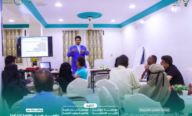 شهدت العاصمة عدن إنعقاد ورشة العمل التدريبية لتعزيز دور المجتمع المدني في إجراءات الحد من مخاطر الكوارث وبناء القدرة على الصمود وبمشاركة 25 منظمة مجتمع مدني في محافظة عدن ، والتي تنظمها مؤسسة سواعد الخير الإنسانية ومؤسسة عدن للبيئة والتنمية وصون الطبيعة وبالشراكة مع الشبكة العربية للبيئة والتنمية رائد و مؤسسة إبداع للبيئة والتنمية المستدامة.