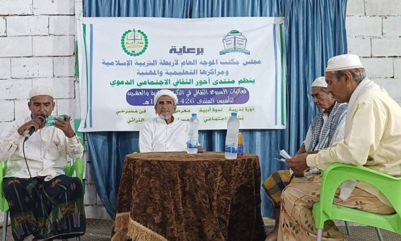 نظم منتدى أحور الثقافي الاجتماعي الدعوي مساء امس السبت ندوة عن الشيخ العلامة المربي والمؤرخ القاضي سالم محمد جنيد (العالم) رحمه الله تعالى (ت. 1410 ه) وذلك في مستهل فعاليات الاسبوع الثقافي الذي ينظمه المنتدى بمناسبة الذكرى الحادية والعشرين لتأسيسه برعاية من مجلس مكتب الموجه العام لأربطة التربية الإسلامية ومراكزها التعليمية والمهنية.