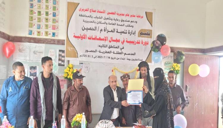 اختتمت صباح اليوم الثلاثاء 5 أغسطس 2025م، الدورة التدريبية في مجال الإسعافات الأولية، التي نظمتها إدارة تنمية المرأة بمديرية الحُصين، واستهدفت عددًا من المتدربات في مراكز (الصرفة، العقلة، والعطرية).وذلك بدعم من إدارة رعاية وتأهيل الشباب بمحافظة الضالع ، ومكتب الصحة العامة والسكان بالمديرية