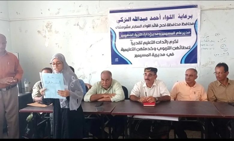 نظمت السلطة المحلية في مديرية المسيمير بمحافظة لحج ممثلة بإدارة التربية والتعليم فعالية تكريمية تربوية هي الأولى من نوعها لتكريم إحدى عشرة معلمة من الرعيل الأول ممن بدأن مسيرتهن التعليمية منذ مطلع الثمانينات وذلك برعاية اللواء الركن أحمد عبدالله تركي محافظ محافظة لحج ورئيس المجلس المحلي.