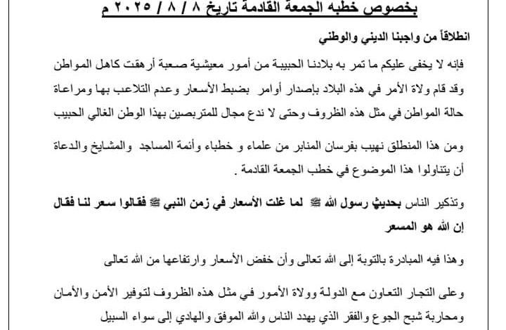 بخصوص خطبة الجمعة القادمة بتاريخ 8 / 8 / 2025م