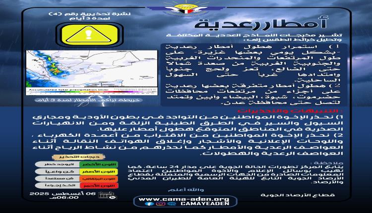 وتوقع المركز بمشيئة الله تعالى، في نشرة تحذيرية لمدة 3 أيام صادرة عنه مساء اليوم الأربعاء 6/8/2025م، استمرار هطول أمطار رعدية – بشكل يومي بعضها غزيرة – على طول المرتفعات والمنحدرات الغربية والجنوبية الغربية، من صعدة شمالاً حتى الضالع وتعز ولحج جنوباً، وامتدادها غرباً حتى السهول الساحلية.