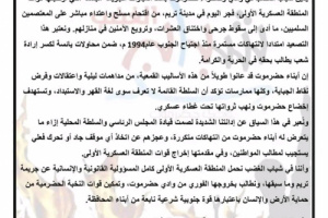 ونعتبر هذا التصعيد امتدادا لانتهاكات مستمرة منذ اجتياح الجنوب عام 1994م، ضمن محاولات يائسة لكسر إرادة شعب يطالب بحقه في الحرية والكرامة. إن أبناء حضرموت قد عانوا طويلاً من هذه الأساليب القمعية، من مداهمات ليلية واعتقالات وفرض نقاط الجباية، وكلها ممارسات تؤكد أن السلطة القائمة لا تعرف سوى لغة القهر والاستبداد، وتستهدف إخضاع حضرموت ونهب ثرواتها تحت غطاء عسكري.