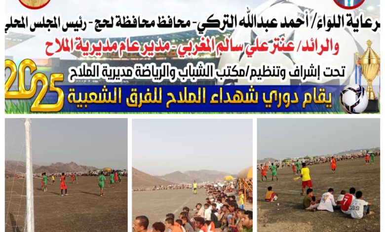 اكتسح فريق الملاح عصر اليوم الخميس فريق صيفر بخماسية مقابل هدفين، ضمن منافسات دوري شهداء مديرية الملاح بنسختة الرابعة، الذي اُقيم برعاية السلطة المحلية ممثلة باللواء احمد عبد الله تركي، محافظ محافظة لحج، والرائد عنتر المغربي مدير عام المديرية، ومساهمة من الشركة الوطنية للأسمنت، ورجل الأعمال سعيد محسن الشعيبي.