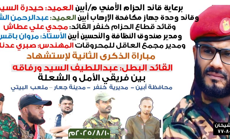 في عاشر أغسطس، لن يكون ملعب الفقيد البيتي مجرد ساحة كرة، بل ميدان وفاء وعرين ذاكرة، حيث تهتف المدرجات باسم رجل واجه الظلام بوجهٍ من نور، القائد عبداللطيف السيد – قاهر الإرهاب – ورفاقه الشهداء الأبطال، الذين خطّوا بدمائهم أبهى فصول التضحية.