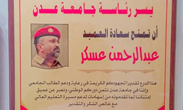 جامعة عدن تكرم قائد معسكر بدر تقديرًا لجهوده في دعم الطلاب الجامعيين