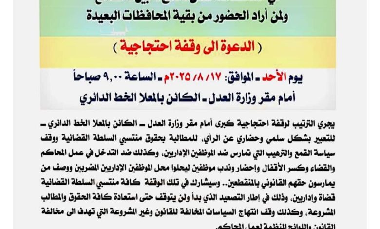 ودعا البيان الصادر عن القاضي شوقي هادي يسلم جرهوم، رئيس نادي القضاة الجنوبي، وكافة الهيئة الإدارية لنقابة الموظفين الإداريين، جميع منتسبي السلطة القضائية في المحافظات المذكورة ومن يرغب في الحضور من المحافظات الأخرى، إلى التواجد في الموعد المحدد، مؤكدين أن “الحقوق تُنتزع ولا توهب”.