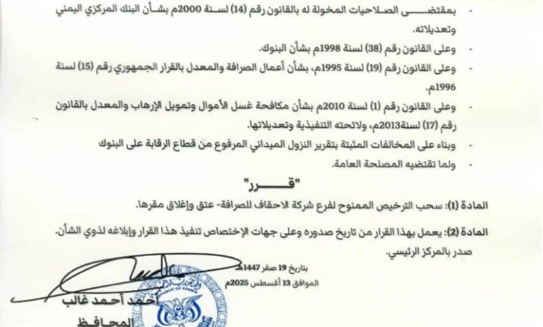 محافظ البنك المركزي يصدر قرار رقم 20 بشأن سحب ترخيص فرع شركة صرافة وإغلاق مقرها
