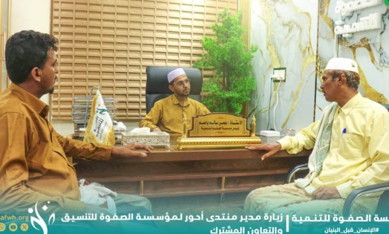 التقى الأستاذ عمر سالم باصم، رئيس مؤسسة الصفوة للتنمية بالعاصمة عدن، الشيخ أ. سعيد العمودي، مدير منتدى أحور، والأستاذ صالح مزاحم العطل، الأمين العام للمنتدى.