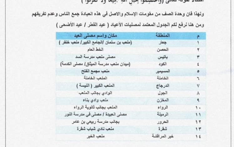 ومن هنا نرفع لكم الجدول المعتمد لمصليات الأعياد ( عيد الفطر / عيد الأضحى )