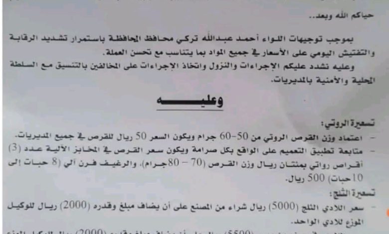 بموجب توجيهات اللواء / أحمد عبدالله تركي محافظ المحافظة باستمرار تشديد الرقابة والتفتيش الدوري على الأسعار في جميع المواد بما يتناسب مع تحسن العملة.