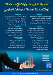 طالب نشطاء وسياسيون وإعلامييون في محافظات الجنوب بسرعة تنفيذ قرارات الإصلاحات الاقتصادية، مشيرين بأن التحسّن الحالي في الجانب الاقتصادي مرهون بالتنفيذ الكامل، والحازم للإصلاحات الاقتصادية التي تتطلب تكاتفًا كاملًا بين المؤسسات المالية والحكومية والأمنية لضمان استدامتها. مشيدين بما أنجزته اللجنة العُليا للإيرادات السيادية والمحلية في إطار برنامج الإصلاحات الشاملة في الجوانب الاقتصادية والمالية والإدارية بالوزارات والمؤسسات.