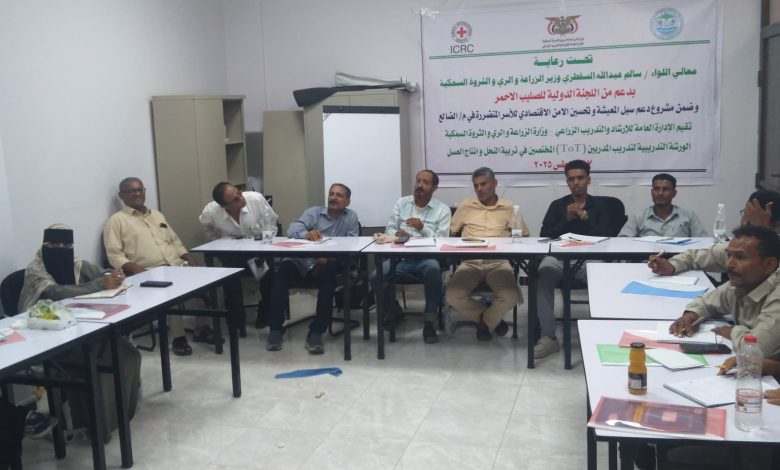 دشنت صباح اليوم برعاية معالي وزير الزراعة والري والثروة السمكية اللواء سالم عبدالله السقطري الدورة التدريبية لتدريب مدربين (TOT) لمختصين في تربية النحل وانتاج العسل بمحافظة الضالع والتي نظتمها الإدارة العامة للارشاد والتدريب الزراعي وبدعم من اللجنة الدولية للصليب الأحمر ضمن مشروع دعم سبل المعيشة وتحسين الامن الاقتصادي للاسر المتضررة في محافظة الضالع