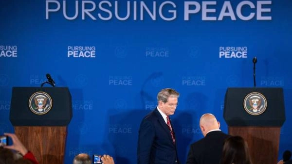 سكوت بيسنت خلال مؤتمر صحفي مشترك مع الرئيس الروسي فلاديمير بوتين والرئيس الأمريكي دونالد ترامب (بلومبيرغ)