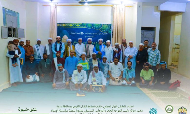 في أجواء إيمانية تعبق بأنوار القرآن الكريم والسنة النبوية الشريفة ، وتحت شعار “قل هذه سبيلي أدعو إلى الله على بصيرة “، شهدت محافظة شبوة ومديرية المحفد إقامة الملتقى الأول لمعلمي حلقات تحفيظ القرآن الكريم وعلومه الشرعية، وذلك برعاية كريمة من مكتب الموجه العام للأربطة الإسلامية مراكزها التعليمية والمهنية ، والمجلس التنسيقي للأربطة والمراكز التعليمية بمحافظة شبوة، وبتمويل سخي من مؤسسة الهجرة الخيرية للتنمية، وتنفيذ مؤسسة الإمداد للتنمية.
