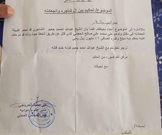 وبحسب وثيقة التحكيم، فقد أصدرت قبيلة آل شاجرة، ممثلة بالشيخ عبدالله أحمد جعيم الشاجري، حكم مشايخ قبيلة الجعادنة (آل امقطيش) في قضية مقتل الشاب علي محمد الجعدني الذي قُتل بطريق الخطأ أثناء تبادل لإطلاق النار بين آل شاجرة وآل باقطيان في مديرية مودية بتاريخ 1 مارس 2024.