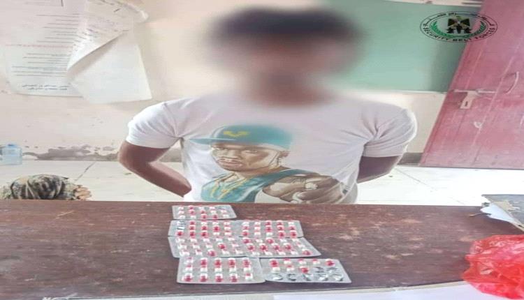 الحزام الأمني بالعاصمة عدن يضبط متهم بحوزته كمية من الحبوب المخدرة