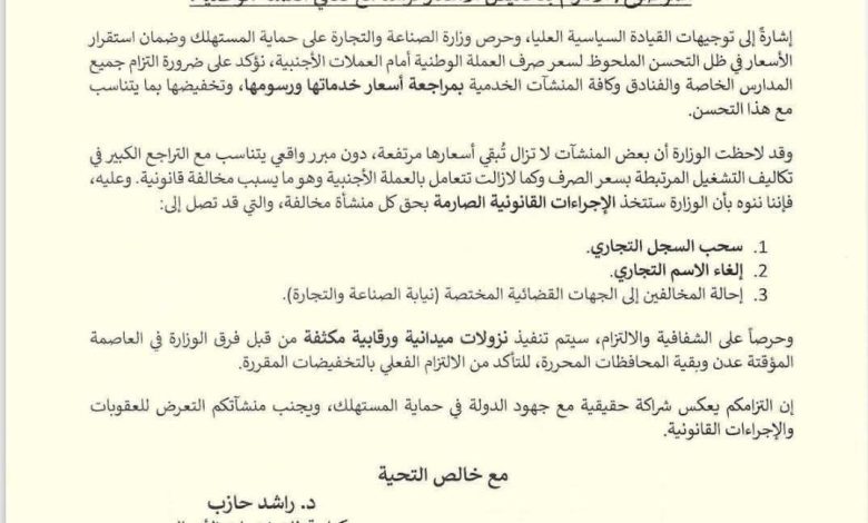 إشارة إلى توجيهات القيادة السياسية العليا، وحرص وزارة الصناعة والتجارة على حماية المستهلك وضمان استقرار الأسعار في ظل التحسن الملحوظ لسعر صرف العملة الوطنية أمام العملات الأجنبية، نؤكد على ضرورة التزام جميع المدارس الخاصة والفنادق وكافة المنشآت الخدمية بمراجعة أسعار خدماتها ورسومها، وتخفيضها بما يتناسب مع تعافي العملة الوطنية.