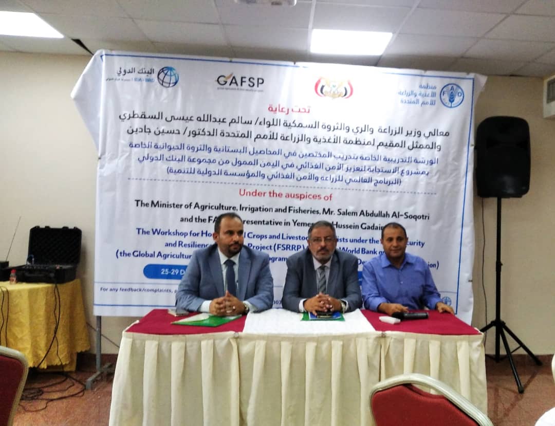 برعاية وزير الزراعة والري والثروة السمكية اللواء سالم عبد الله السقطري والممثل المقيم لمنظمة الاغذية والزراعة حسن جادين، أُقيمت بالعاصمة عدن الورشة التدريبية الخاصة بتدريب المختصين في المحاصيل البستانية والثروة الحيوانية الخاصة بمشروع لاستجابة لتعزيز الأمن الغذائي في اليمن الممول من مجموعة البنك الدولي «البرنامج العالمي للزراعة والامن الغذائي والمؤسسة الدولية للتنمية.