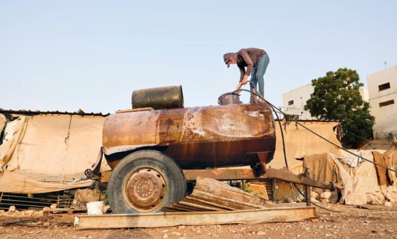 فلسطيني يملأ خزان مياه في قرية بردلة بالضفة الغربية