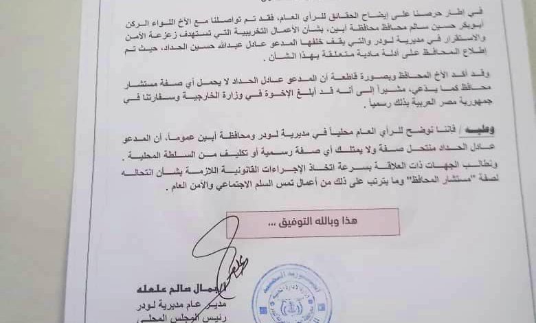 وعليه فإننا نوضح للرأي العام محلياً في مديرية لودر ومحافظة أبين عموماً، أن المدعو عادل الحداد منتحل صفة ولا يمتلك أي صفة رسمية أو تكليف من السلطة المحلية.