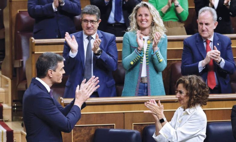 سانشيز (يساراً) يحظى بتصفيق أعضاء البرلمان الأسبوع الماضي بعد إعلانه أن إسبانيا ستعترف بدولة فلسطين |