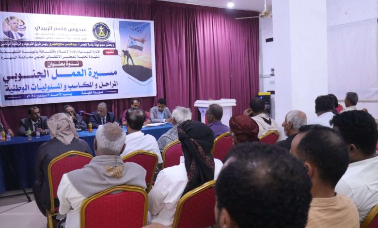 انتقالي المهرة ينظم ندوة سياسية بعنوان “مسيرة العمل الجنوبي.. الانطلاقة والمكتسبات والمسؤوليات”