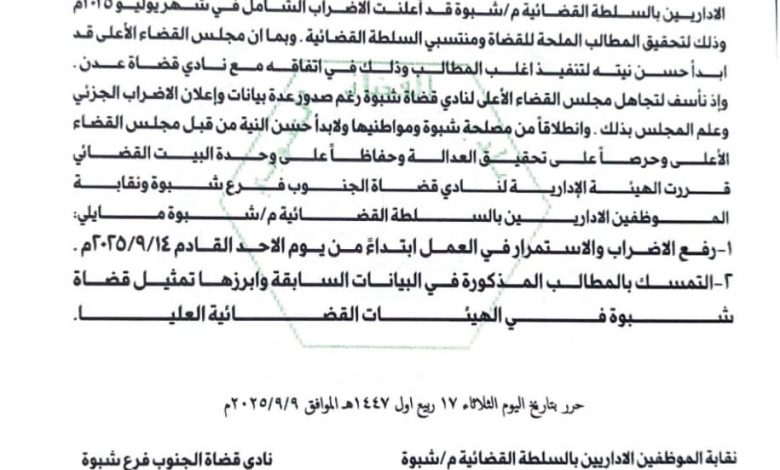 وأكد البيان أن قرار رفع الإضراب جاء انطلاقاً من مصلحة محافظة شبوة ومواطنيها، واستجابةً لحسن النية الذي أبداه مجلس القضاء الأعلى في اتفاقه الأخير مع نادي قضاة عدن، رغم تجاهله المتكرر لمطالب نادي قضاة شبوة، والتي تم التعبير عنها عبر بيانات رسمية سابقة.