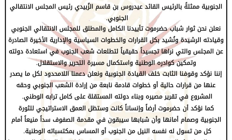 إننا نؤكد وقوفنا الثابت خلف القيادة الجنوبية ونعلن دعمنا اللامحدود لكل ما يصدر عنها من قرارات حالية أو خطوات قادمة نابعة من إرادة الشعب الجنوبي وحقه المشروع في تقرير مصيره وبناء دولته المستقلة على كامل ترابه الوطني.