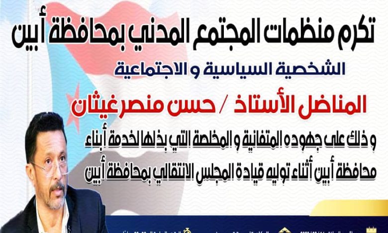 اللجنة التحضيرية تدعو أبناء أبين للحضور والمشاركة الفاعلة في الحفل التكريمي للأستاذ حسن غيثان يوم غدٍ الأحد