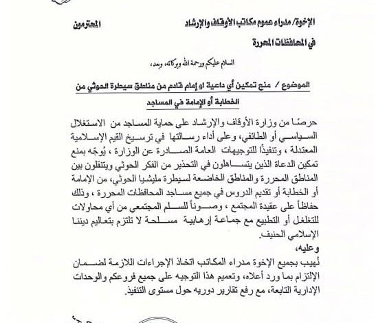 الموضوع: منع تمكين أي جماعة أو إمام قادم من مناطق سيطرة الحوثي من الخطابة أو الإمامة في المساجد