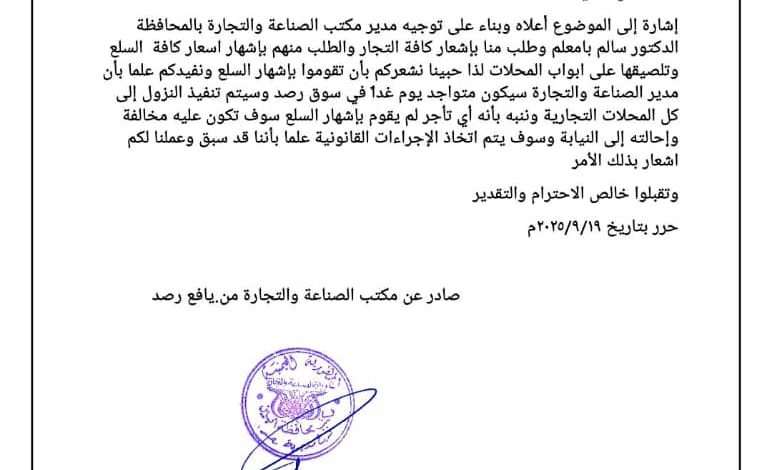 اصدر مكتب الصناعة والتجارة بمديرية يافع رصد محافظة أبين تعميماً رسمياً إلى جميع تجار الجملة والتجزئة في مختلف مناطق وأسواق المديرية يقضي بضرورة إشهار أسعار السلع وإلصاقها على واجهات المحلات التجارية.