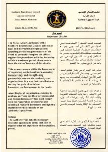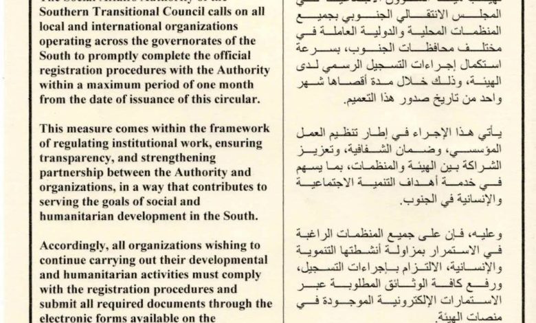 تهيب هيئة الشؤون الاجتماعية في المجلس الانتقالي الجنوبي بجميع المنظمات المحلية والدولية العاملة في مختلف محافظات الجنوب، بسرعة استكمال إجراءات التسجيل الرسمي لدى الهيئة، وذلك خلال مدة أقصاها شهر واحد من تاريخ صدور هذا التعميم.