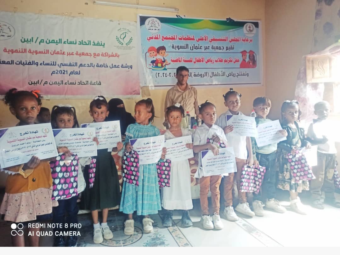 نظمت جمعية عبر عثمان النسوية بمديرية خنفر بمحافظة أبين اليوم بمقر الجمعية حفلاً تكريميا لطلاب الروضه للعام الدراسي 2022 – 2023 م برعاية المجلس التنسيقي الأعلى لمنظمات المجتمع المدني بالمحافظة.