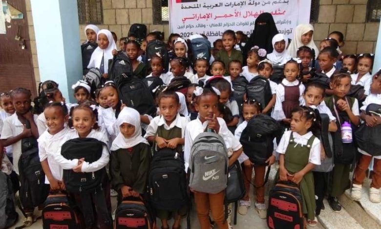 الهلال الأحمر الإماراتي يدشن مشروع توزيع الحقائب المدرسية في أبين أبين