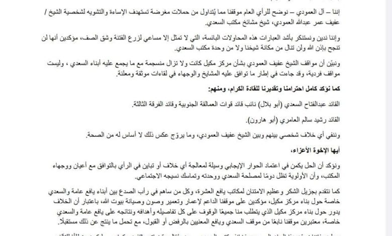 بيان توضيحي حول الحملات المغرضة ضد الشيخ عفيف والتأكيد على تماسك مكتب السعدي