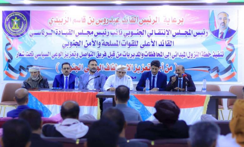 والقى الشيخ الجفري كلمة نقل في مستهلها للحاضرين، تحيات الرئيس القائد عيدروس الزُبيدي، رئيس المجلس الانتقالي الجنوبي، موكدا أن نزولات فريق التواصل تأتي بتكليف من الرئيس القائد عيدروس الزُبيدي، بهدف تعزيز التواصل بين القيادة وجماهير شعب الجنوب، والوقوف على همومهم واحتياجاتهم، مسيرًا إلى أن هذه الزيارات تأتي في ظل متغيرات سياسية محلية ودولية تتطلب رص الصفوف والتمسك بالأهداف السامية التي ضحى من أجلها شعب الجنوب،