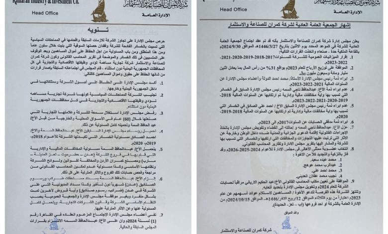 أكد مجلس إدارة شركة كمران للصناعة والاستثمار بأن ماسيق من أخبار تناولتها بعض القنوات و المواقع الإعلامية لا يستند إلى أي حقيقة وان ما روج له من وجود ضغوطات تمارس على مجلس الإدارة لتبنى مواقف وقناعات تخالف مصالح الشركة ليست سوى محض افتراء وكذب ومحاولة تضليل الرأي العام وخلط الأوراق بقصد الإضرار بالشركة واصولها ومساهميها وموظفيها.