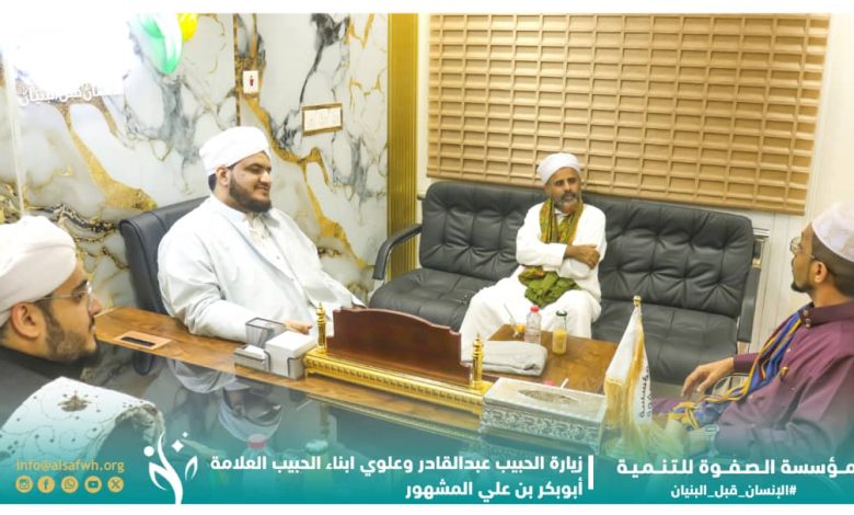 بدروه أشاد السادة عبدالقادر وعلوي، بالجهود الكبيرة التي تبذلها مؤسسة ومنتدى الصفوة في مختلف المجالات، والنجاحات العظيمة التي تحققت على الأصعدة كافة، سائرين على النهج الوسطي المعتدل والتوجيهات السديدة للحبيب العلامة المربي أبي بكر المشهور “رحمه الله تعالى”.