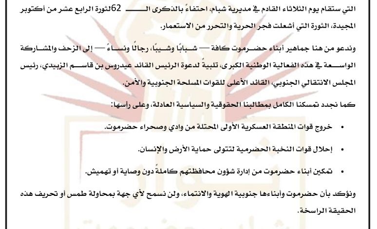 انطلاقًا من واجبنا الوطني الجنوبي، وتجسيدًا لروح النضال التي سطرها أحرار الجنوب في مختلف الميادين، يعلن ثوار شباب حضرموت بوادي وصحراء حضرموت مشاركتهم الفاعلة في الفعالية الجماهيرية الكبرى التي ستقام يوم الثلاثاء القادم في مديرية شبام، احتفاءً بالذكرى الـ 62 لثورة الرابع عشر من أكتوبر المجيدة، الثورة التي أشعلت فجر الحرية والتحرر من الاستعمار.