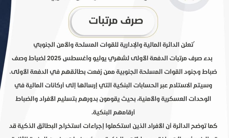 تعلن الدائرة المالية والإدارية للقوات المسلحة والأمن الجنوبي عن بدء صرف مرتبات الدفعة الأولى لشهري يوليو وأغسطس 2025 لضباط وصف ضباط وجنود القوات المسلحة الجنوبية