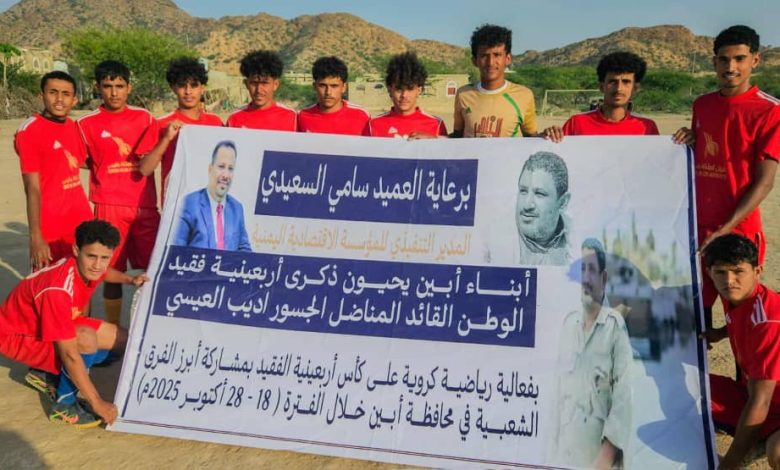 تواصلت اليوم الخميس في مديرية لودر بمحافظة أبين، ولليوم الثالث على التوالي وفي أجواء تنافسية رائعة، منافسات بطولة أربعينية فقيد الوطن أديب العيسي (رحمه الله) لكرة القدم لفرق المنطقة الوسطى الشعبية، والتي يرعاها العميد سامي صالح السعيدي، مدير عام المؤسسة الاقتصادية، وتقام بمشاركة ١٨ فريقا وزعوا إلى أربعة تجمعات في مناطق مختلفة، تلعب بطريقة خروج المغلوب، على أن يتأهل بطل كل تجمع إلى المربع المربع الذهبي.