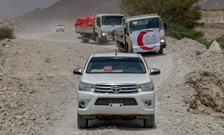 الهلال الإماراتي يسيّر قافلة مساعدات غذائية لأهالي مديرية حجر