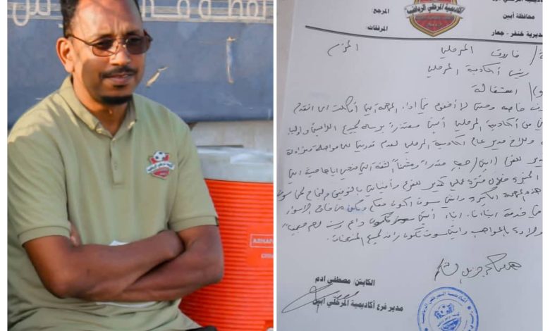 مصطفى آدم يقدم استقالته من أكاديمية المرحلي م/ أبين ..