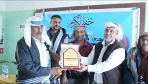 وفي ختام الحفل تم تڪريم الشاعر “السعيدي” بدرع وحافز مالي مقدم من شباب باڪازم بالمحفد نظيراً لموسوعتة الشعرية التي يٌحظى بها بالمديرية