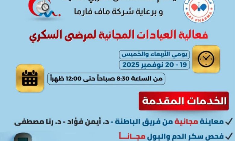 تنظم إدارة المستشفى العربي الحديث فعالية العيادات الصباحية المجانية لمرضى السكري، برعاية شركة ماف فارما، اليوم الأربعاء وغدآ الخميس الموافق 19 و20 نوفمبر 2025، خلال الفترة الصباحية.