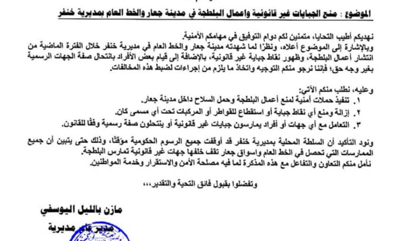 توجيهات صارمة من مدير عام مديرية خنفر لوقف الجبايات في جعار والخط العام(وثيقة )
