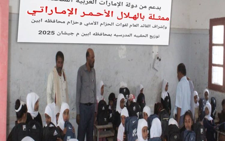 الهلال الاحمر الإماراتي يدشن توزيع الحقائب المدرسية بمديرية جيشان